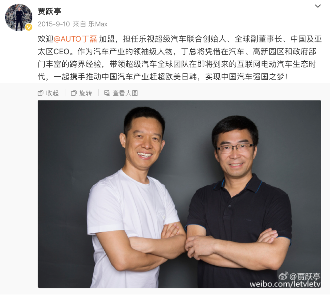 2015年9月,时任乐视CEO贾跃亭在微博发文,庆祝丁磊加盟乐视超级汽车。而在此之前,贾跃亭曾为丁磊的职位伤过脑筋。