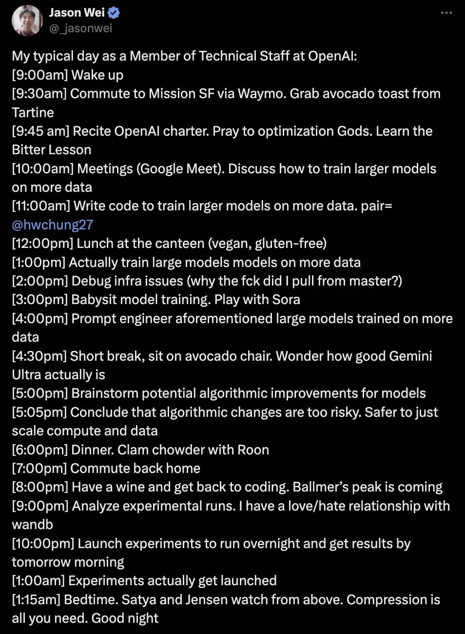 今天凌晨,OpenAI的研究人员Jason Wei自曝每日作息时间,不少网友感叹,原来不只国内卷,OpenAI也搞“996”。