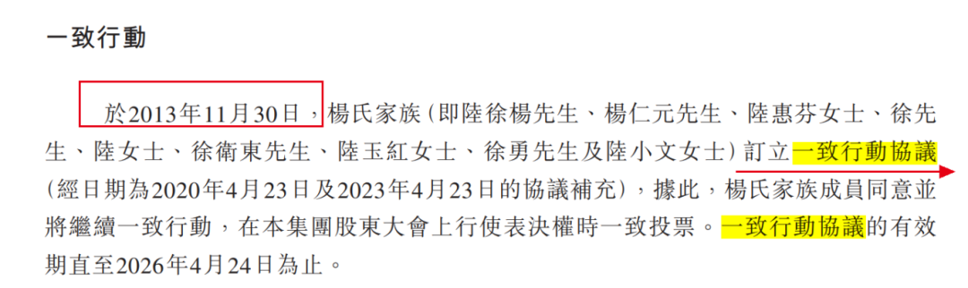 2013年11月,徐晓平、陆小红以及儿子陆徐杨,陆小红的父母、两位妹妹和各自的配偶共同组成的杨氏家族,订立了一致行动协议。