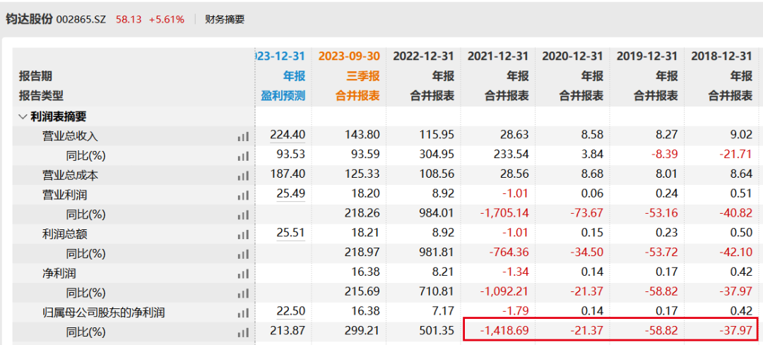 不过,这节节攀升的业绩又迎来了一个新的转折点。2月21日晚,钧达股份发布2023年业绩快报。报告期内,公司实现归母净利润8.32亿元,而在2023年前三季度,公司的归母净利润达到了16.38亿元。若仅从财务数据来看,2023年第四季度,公司归母净利润亏损约8亿元。