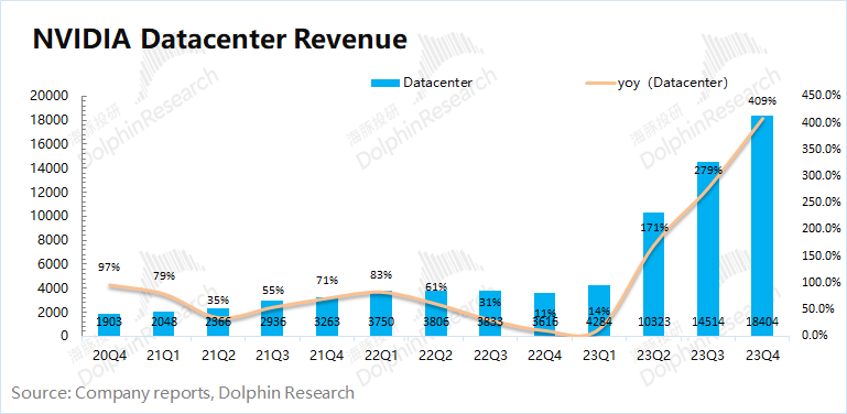 2)本季度数据中心业务同比增长409%,再创新高,主要是由大模型、推荐引擎和生成式 AI的强劲需求推动。