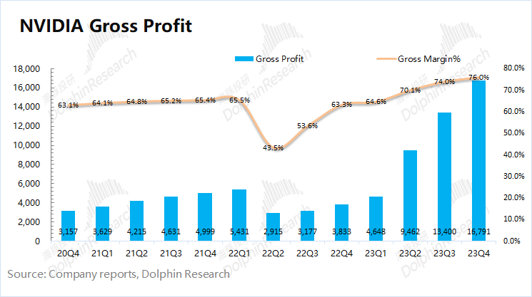 1.2 毛利率(GAAP): 2024财年第四季度英伟达实现毛利率(GAAP)76%,再超指引预期上限(74%-75%),本季度毛利率继续创出新高。