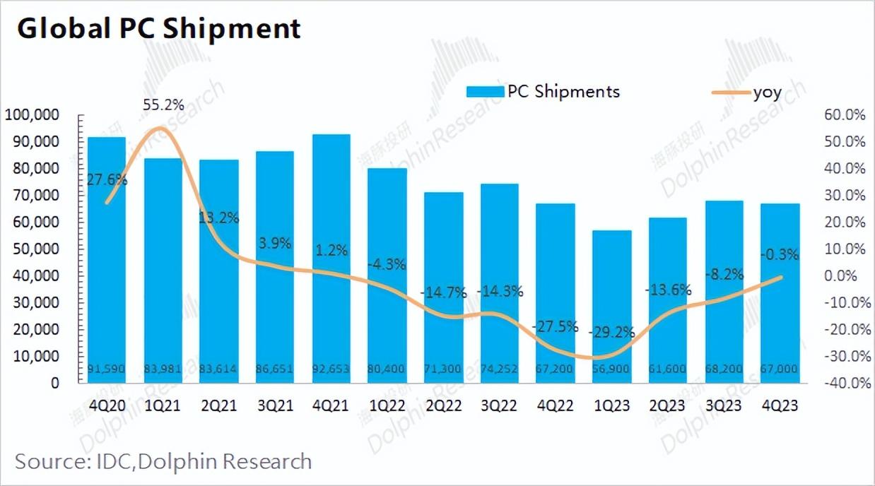全球PC市场出货量在四季度已经开始止跌。根据IDC最新的数据,2023年四季度全球PC市场出货为6700万台,同比几乎持平。需求开始走出底部,PC出货量修复至6500万台以上。