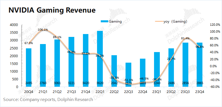 1)本季度游戏业务同比增长56.5%,继续回暖。海豚君认为公司本季度游戏业务回暖的主要原因是:a)PC市场的回暖,一定程度上也增加了对GPU的需求;b)近期币值的上涨,也提升了部分显卡的需求;