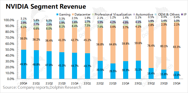 在AI等需求的带动下,2024财年第四季度英伟达数据中心业务在公司收入中的份额继续扩大,本季度达到了83.3%。虽然游戏业务本季度也有增长,但占比仍被高速增长的数据中心压缩至2成以下。数据中心,已经成为对公司影响最大的业务。