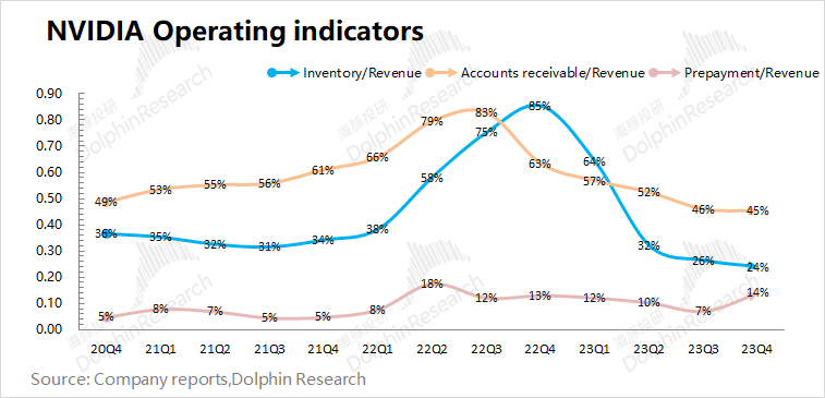 公司之前毛利率的骤降,主要是公司进行了存货减计的处理。在毛利率重回63%-64%时,存货已经不是问题。结合公司的存货情况,英伟达本季度的存货继续提升至53亿美元。和大幅增长的收入相比,英伟达当前的存货水位依然很低,仍处于供不应求的情况。