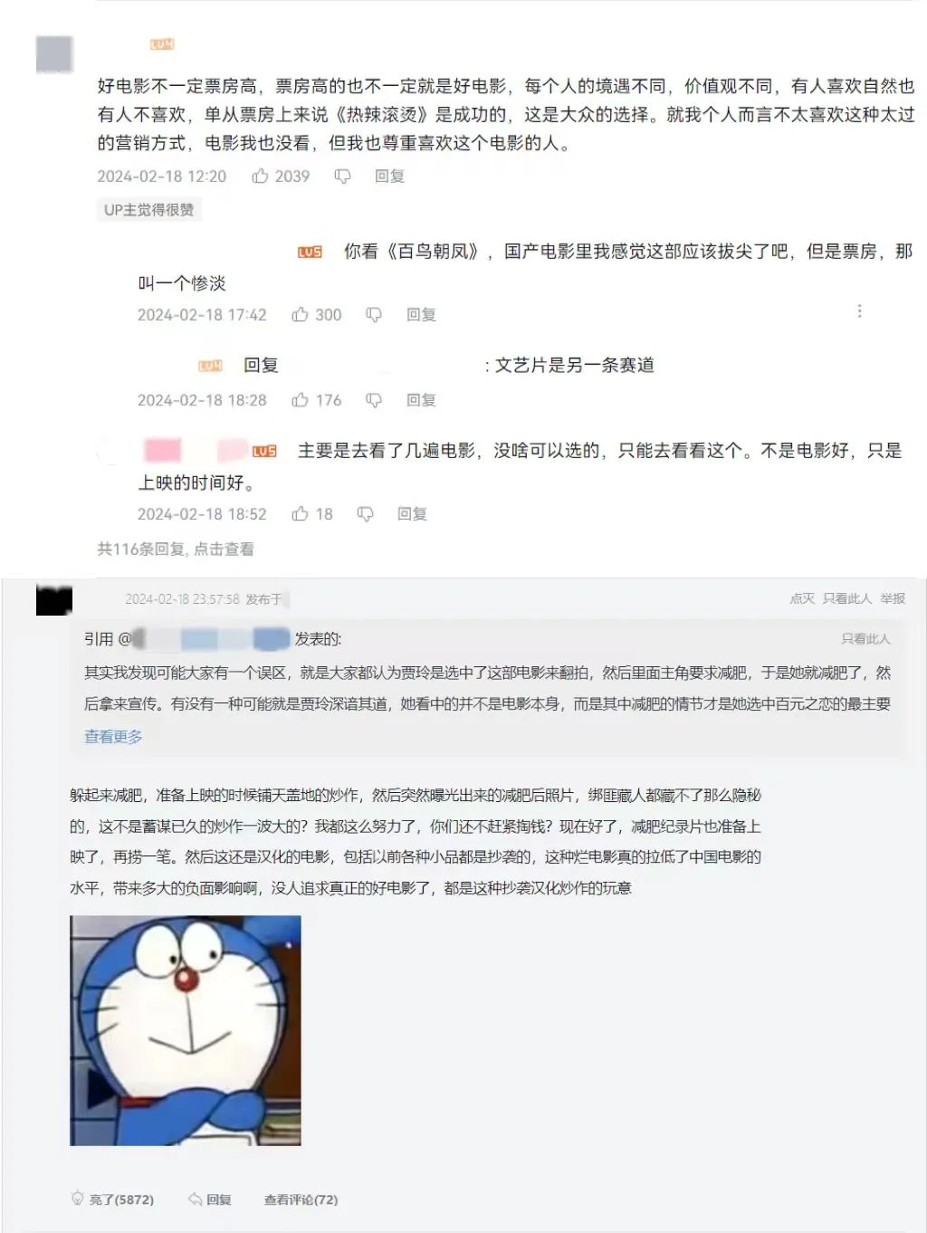 到春节档接近尾声时,关于《热辣滚烫》的讨论又变成了营销过度、翻拍、“抄袭”等。
