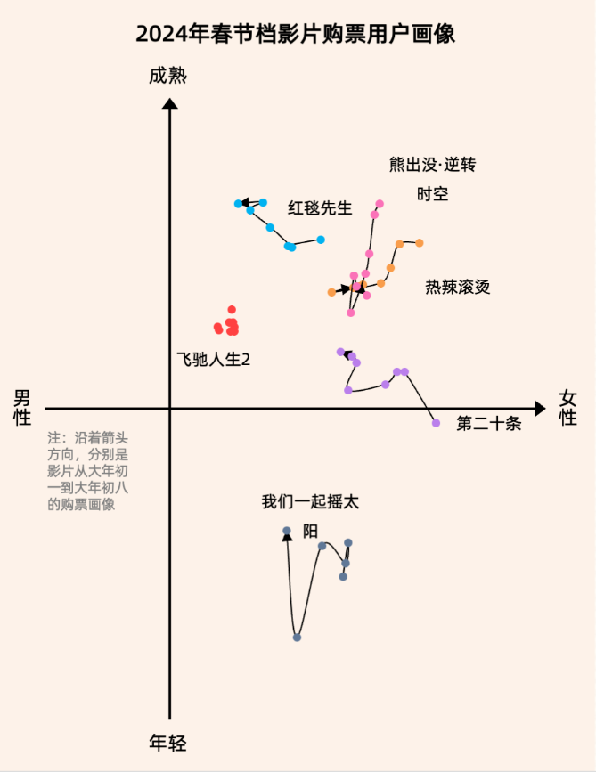 从打分人数上看,《飞驰人生2》收获了14.4万人评分,是其它三部的两倍有余。这也符合几部影片在春节档的购票用户画像,据灯塔研究院《2024年春节档电影市场洞察报告》,《飞驰人生2》是大盘中购票用户最接近男性区间的影片,并且在档期前中后期画像十分稳定。