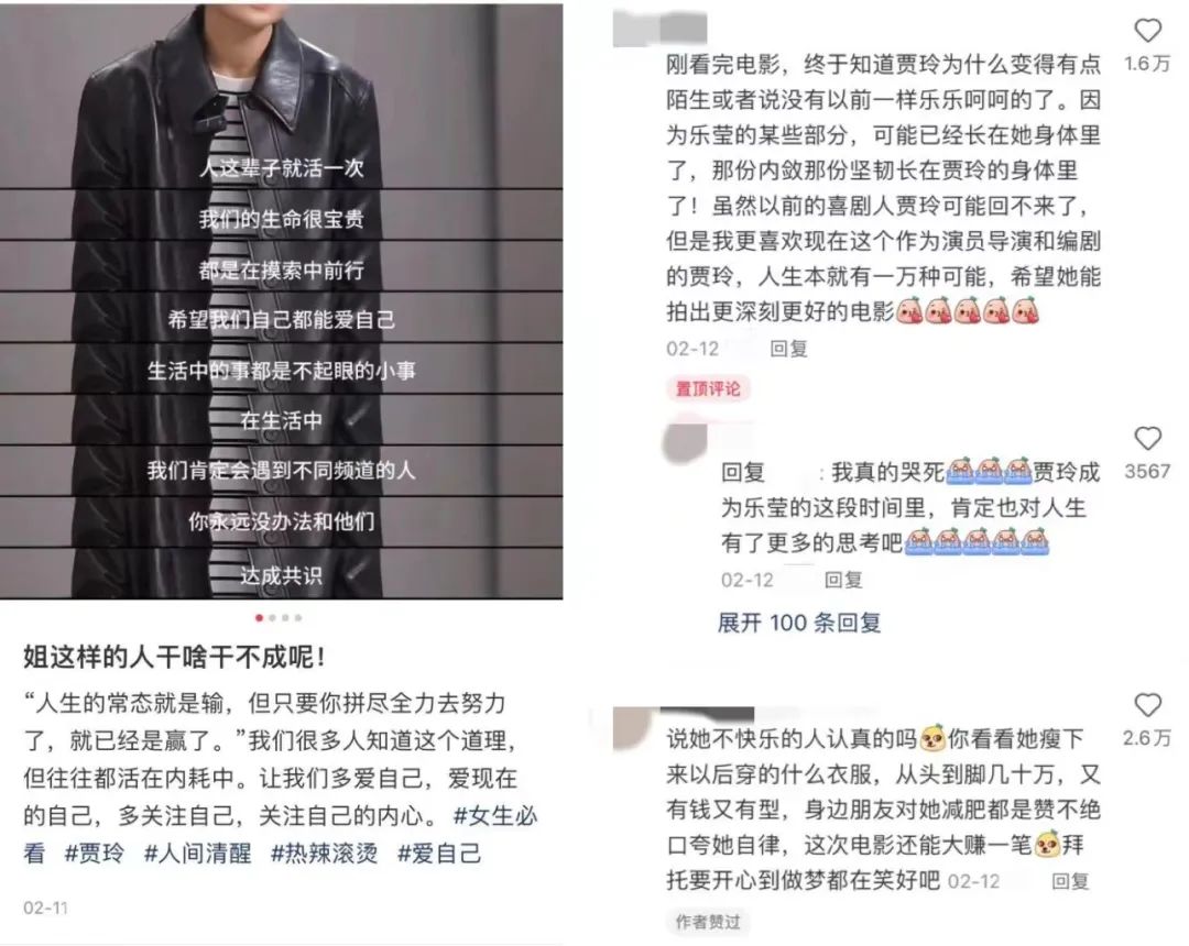 除了影片内容本身,大量讨论也指向对贾玲本人的评价。不同于虎扑认为“我上我也行”,小红书用户更关注贾玲拍片背后的心理动因,以及对其行为的鼓励。