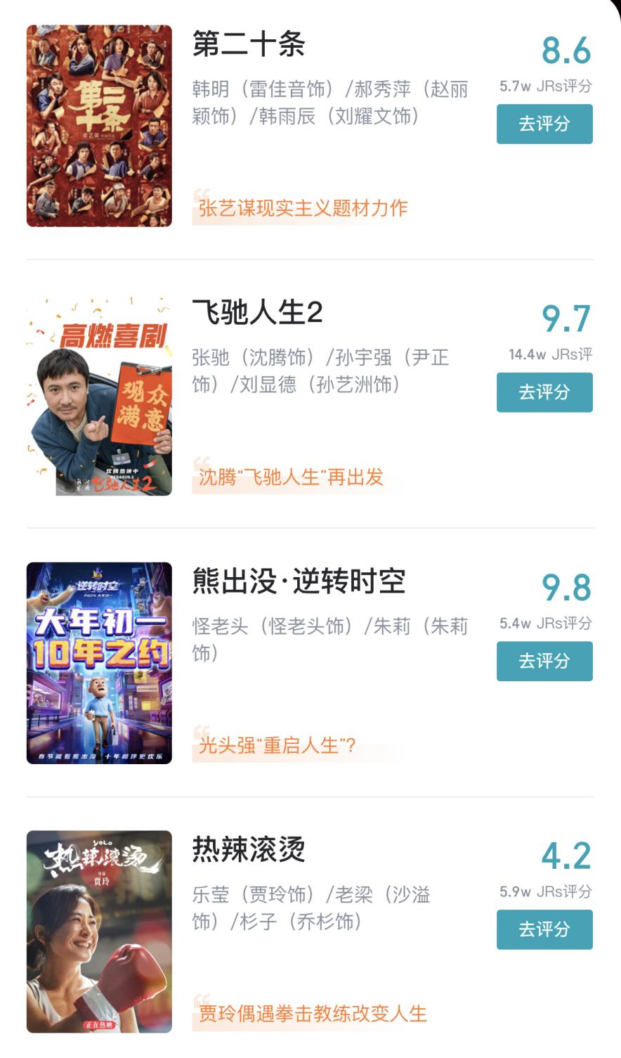 从分数上看,春节档冠军《热辣滚烫》仅4.2分,而《飞驰人生2》和《熊出没·逆转时空》则分别得到了9.7和9.8的高分,《第二十条》8.6分,处于中游。