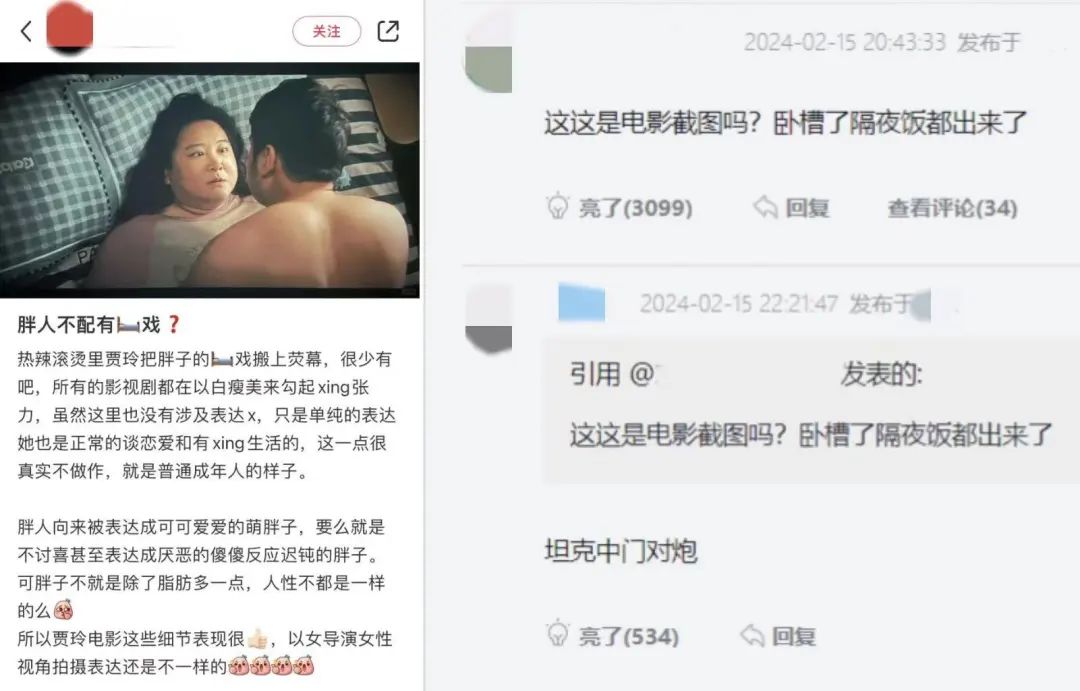 比如,同样的一张照片、一段情节,在小红书上的解读是“以往影视剧中胖人很少有床戏,女导演女性视角的拍摄表达还是不一样”,而到了虎扑,评论是“隔夜饭都出来了”。