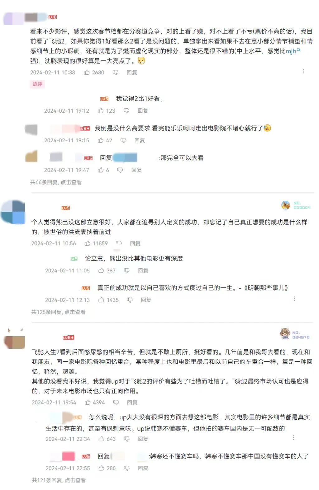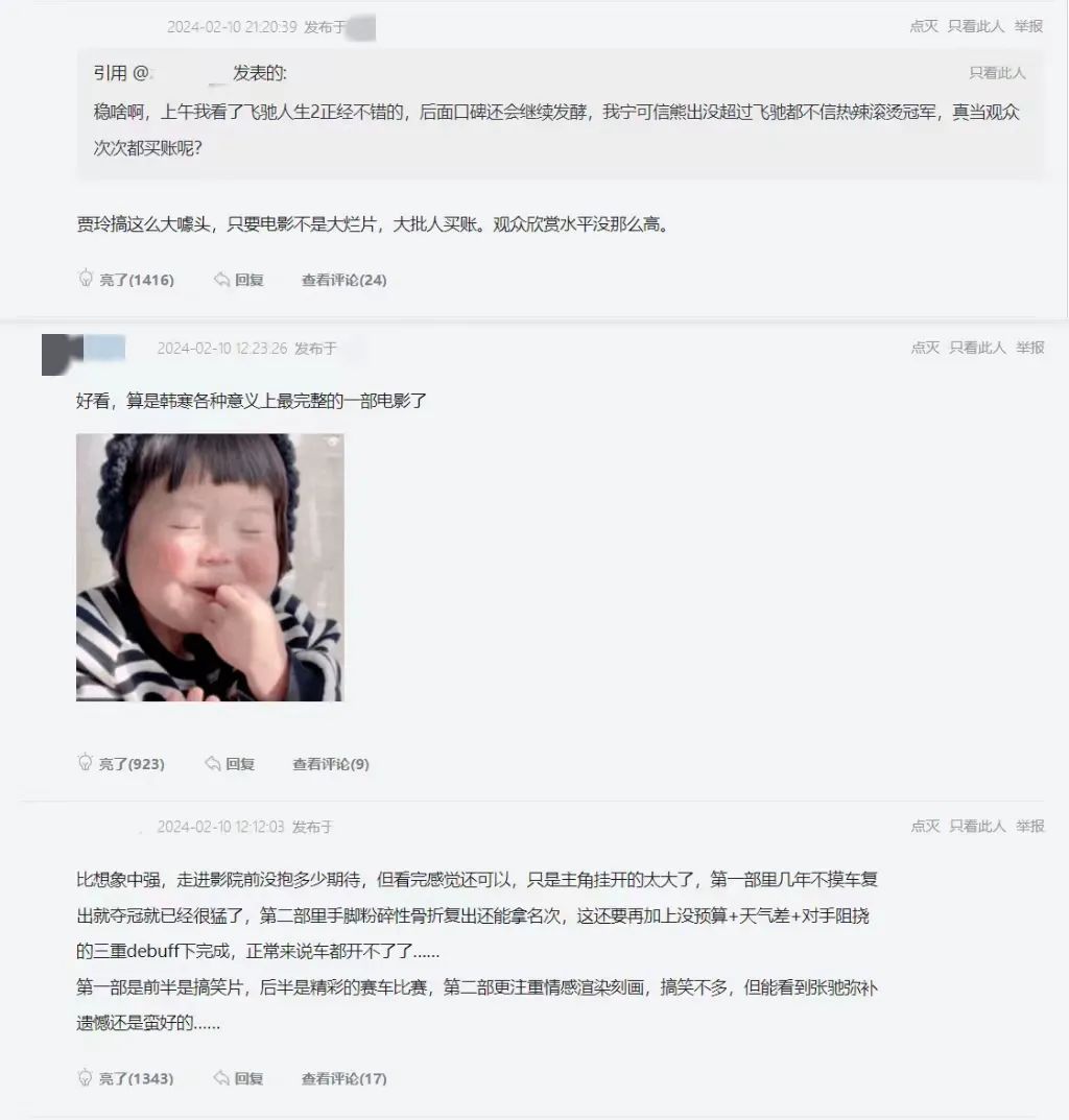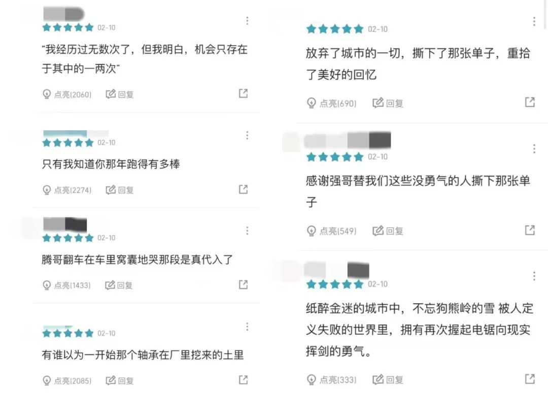 而对于《飞驰人生2》和《熊出没·逆转时空》,前排点亮数多的评论更多都是针对电影内容的,尤其是一些令人印象深刻的台词。