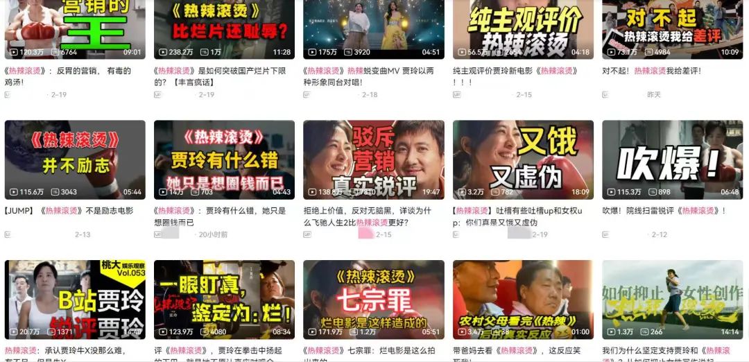分影片来看,《热辣滚烫》在UP主做的视频里,骂“烂片”的数量占比更高,但也有极个别的UP主“吹爆”。也是基于视频平台的特性,B站相较于另外两个社区,标题的耸动性更强,态度更加激烈。![]()