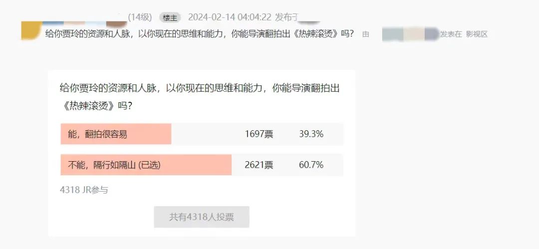 一个有趣的番外是,有用户发起了“给你贾玲的资源和人脉,你能导演翻拍出《热辣滚烫》吗?”投票,共4000多用户参与其中,40%的人选择了“能”。