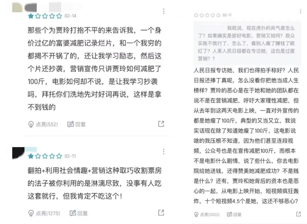 在前排点亮数多的评论中,虎扑用户对《热辣滚烫》的差评集中于产品思路和营销动作方面,认为影片是“减肥纪录片”,在营销方面“过度专注于减肥”。