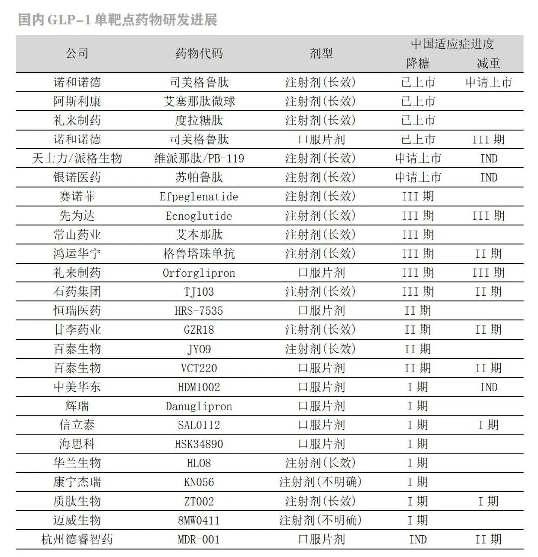 国产GLP-1单靶点长效注射剂进度(降糖):天士力/派格生物PB-119(NDA)、银诺医药苏帕鲁肽(NDA)、先为达Ecnoglutide(III期)、常山药业艾本那肽(III期)、鸿运华宁格鲁塔株单抗(III期)、石药集团TJ103(III期)、甘李药业GZR18(II期)。