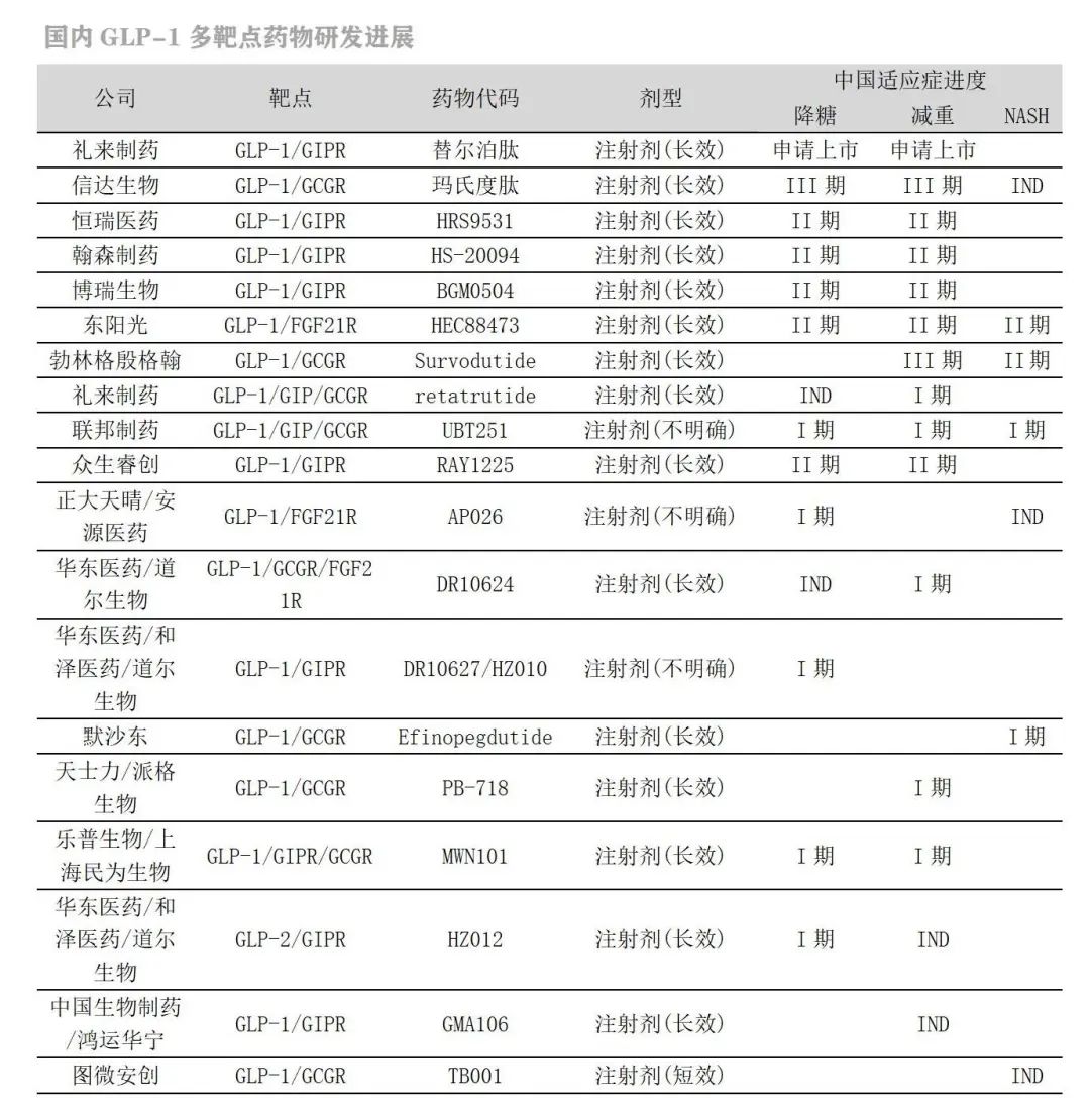 GLP-1/GIPR/GCGR三靶点长效注射剂(减重):联邦制药UBT251(I期)、华东医药/道尔生物DR10624(I期)、乐普生物/民为生物MWN101(I期)。