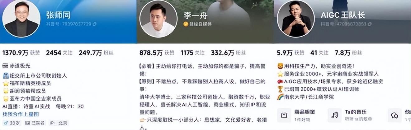 李一舟的爆火更是证明这门生意利润之高。鹤老师(抖音粉丝777.9万)、张诗童(现改名张诗同,抖音粉丝249.7万)、王队长(抖音号元宇宙王队长粉丝23.7万,抖音号AIGC王队长粉丝7.8万)等,都是近两年陆续进场的博主。