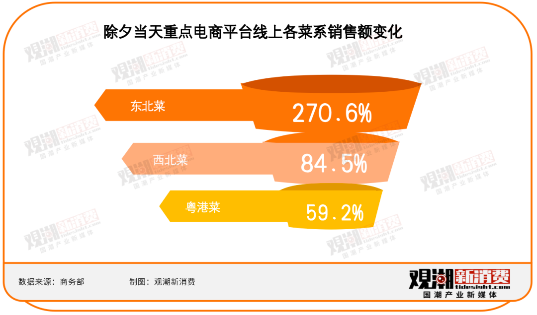 商务部大数据监测显示,除夕当天重点电商平台在线餐饮销售额同比增长40.8%;其中东北菜线上销售额增长高达270.6%。