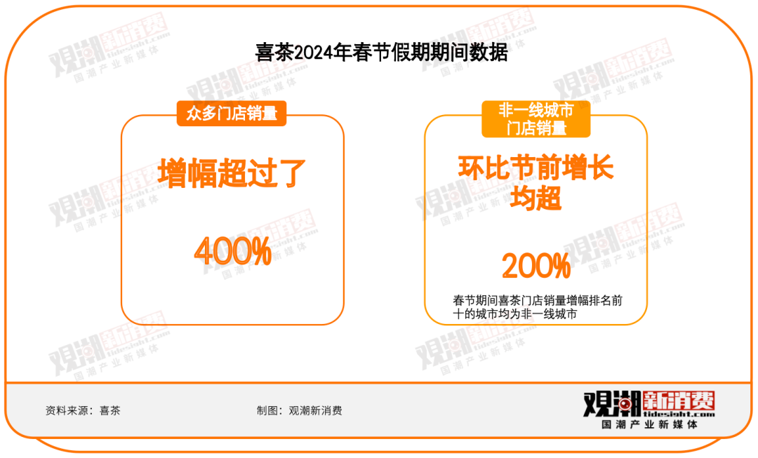 观潮研究院整理数据发现,春节期间喜茶门店销量增幅排名前十的城市均为非一线城市,河南安阳、湖北黄冈、江西抚州、安徽淮南、四川广安、河北邯郸、福建南平、江苏连云港等城市的喜茶门店销量环比节前增长均超200%。