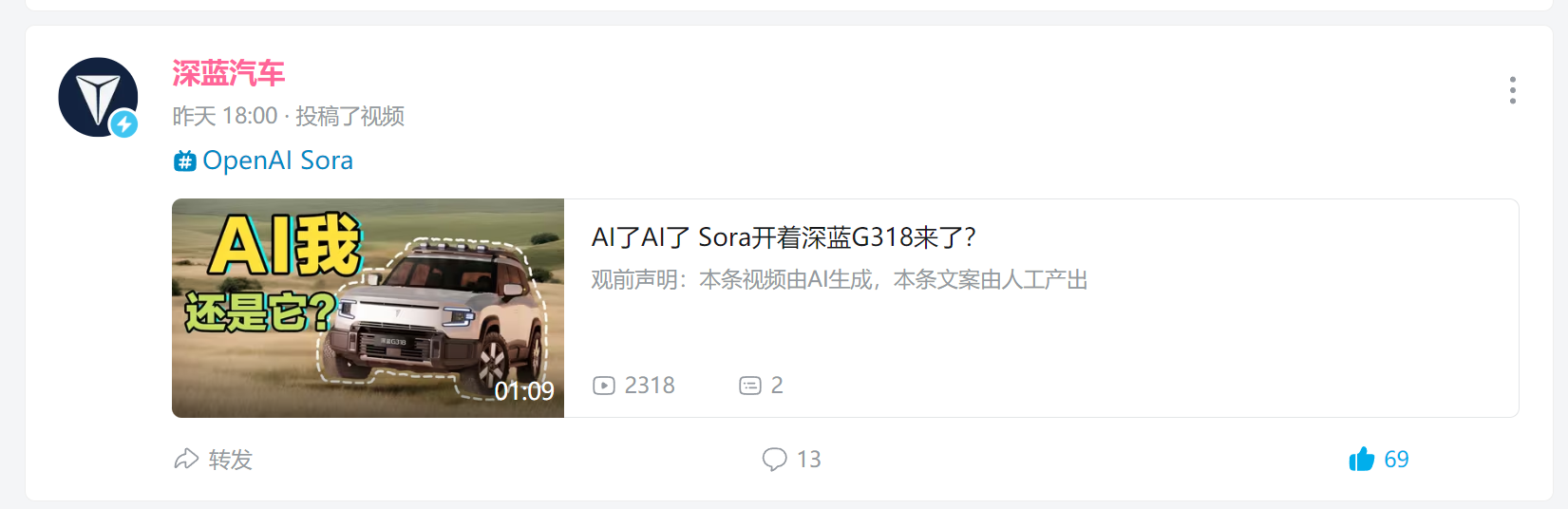 不久前,深蓝汽车更新了一条用AI生成的G318新车视频,视频中罗列了一系列AI「想象中」的G318,表示将借助Sora的能力,「拍摄」一段G318的新车视频,并抛出一个疑问——AI真的能拍出G318的美吗?