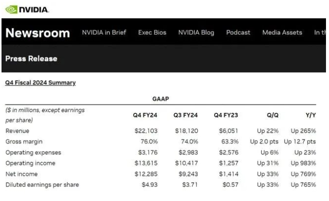 英伟达当天公布的财报数据显示,按照美国通用会计准则,第四季度收入221亿美元,同比增长265%,净利润122.85亿美元,同比增长769%。这两项关键指标双双超出市场预期。