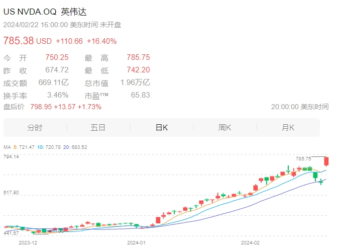亮眼的财报数据势必会给市场注入信心,股价也将在短期内受益。凭借财报的利好,连续下跌四天的英伟达股票在当天盘后再度飚涨。北京时间2月22日晚,美股开盘之后,英伟达的股价暴涨15%,截至收盘,英伟达报785.38美元,涨16.4%,市值逼近2万亿美元,为微软、苹果之后第三高。