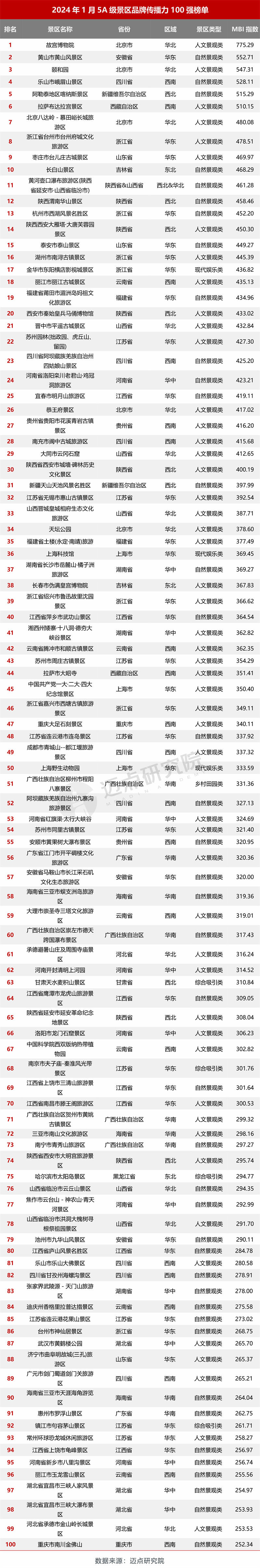 以下是迈点研究院独家发布“2024年1月5A级景区品牌传播力(MBI)100强榜单”。1月,故宫博物院、黄山市黄山风景区、颐和园、乐山市峨眉山景区、阿勒泰地区喀纳斯景区、拉萨布达拉宫景区、北京八达岭-慕田峪长城旅游区、浙江省台州市台州府城文化旅游区、枣庄市台儿庄古城景区、长白山景区跻身榜单前十。