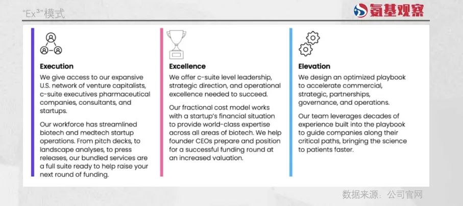 作为一家风投机构,Portal为biotech提供的最核心资源必然是资金,但同时其还能够提供设备齐全的实验室空间作为研发使用,以及被公司称之为解放创始人的“Ex³”模式。