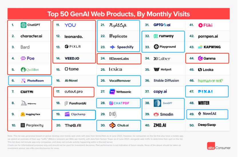 今年 9 月,国际著名风投机构 a16z 推出了 2023 上半年 AI 产品榜单(按网站流量排名)。