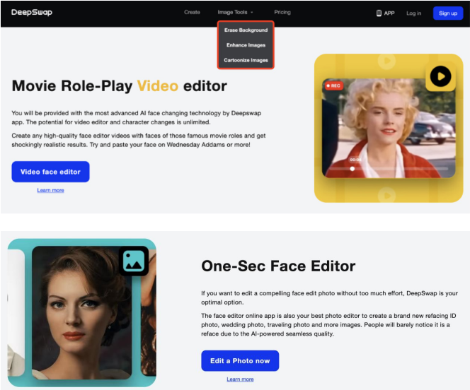 DeepSwap 换脸功能入口,红框中是加入的AI修图功能|图片来源:DeepSwap