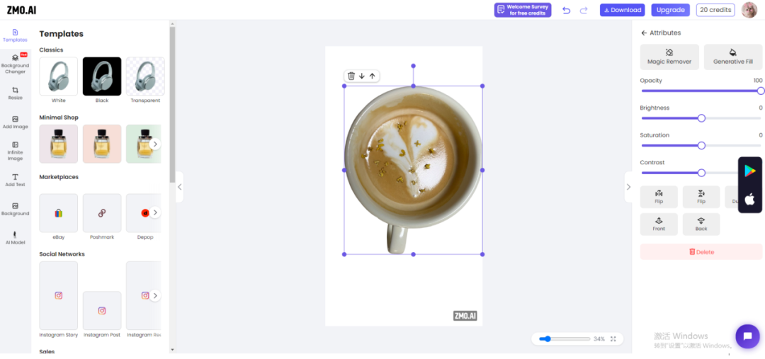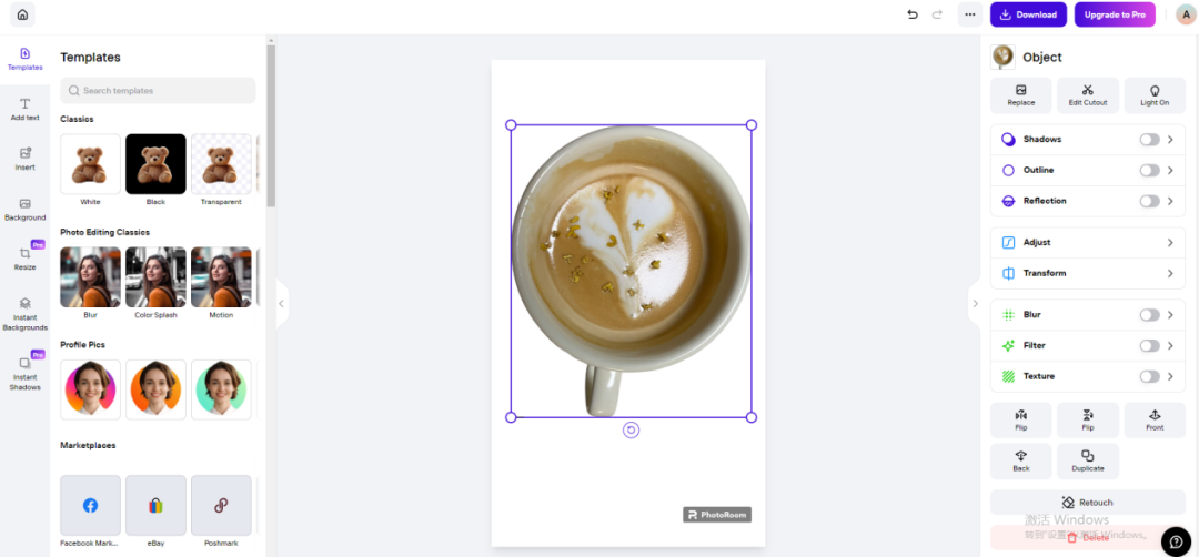 打开 Zmo.ai(上)的图片生成版块,拖进图片后,熟悉感扑面而来,不说与 Photoroom(下)完全一样,也是借鉴了不少。从设计和功能来讲,都是面向创作者和 B 端商家的。