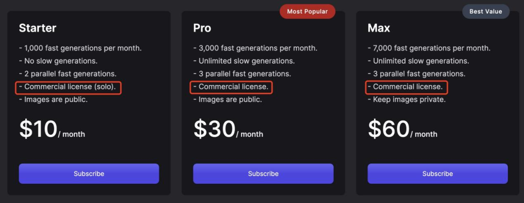 从付费的角度看,Lexica 的用户每周可以免费生成 48 张图像,也可以自由地下载社区内的所有图片,这个免费额度在同类产品中是比较高的。但是 Lexica 要求用户必须付费订阅后,才能将生成和下载的图片商用,而且必须购买最高等级的订阅才能禁止其他用户下载你生成的图片。貌似,Lexica 在“商用”这个点上作文章来卡付费。