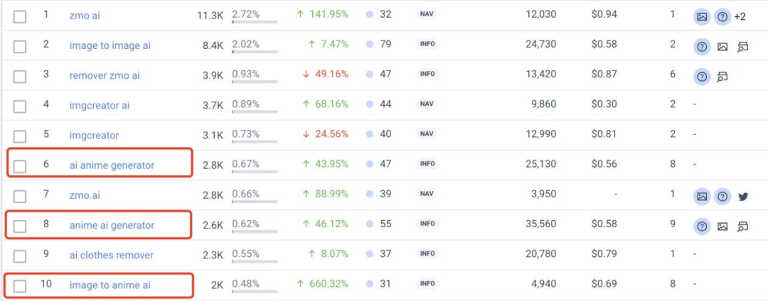 但是观察 ZMO.ai 的搜索关键词发现,Top10 搜索关键词中已经看不到商拍有关的关键词了。而除了品牌关键词之外,带有“anime(指日本动漫)”的关键词出现了 3 次,“img creator(图片创作者)”也出现了 2 次,位置还比较靠前,这说明,不论是从用户画像、还是产品功能,Zmo.ai 可能发生了一些变化。