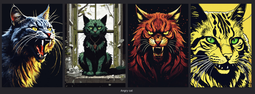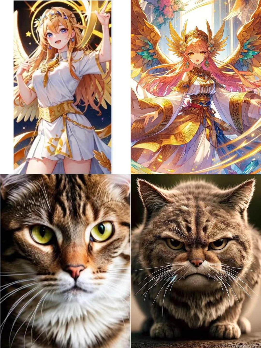 ZMO.ai 生成的图片(左),用相同提示词让 ChatGPT 生成的图片(右)注:提示词“带金色翅膀的天使,动漫风”(上) “愤怒的猫咪,写实风”(下)
