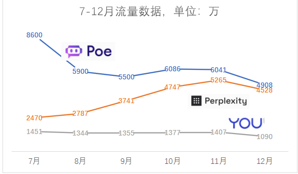 Poe、Perplexity.ai、YOU,7-12 月的流量数据|数据来源:Similarweb