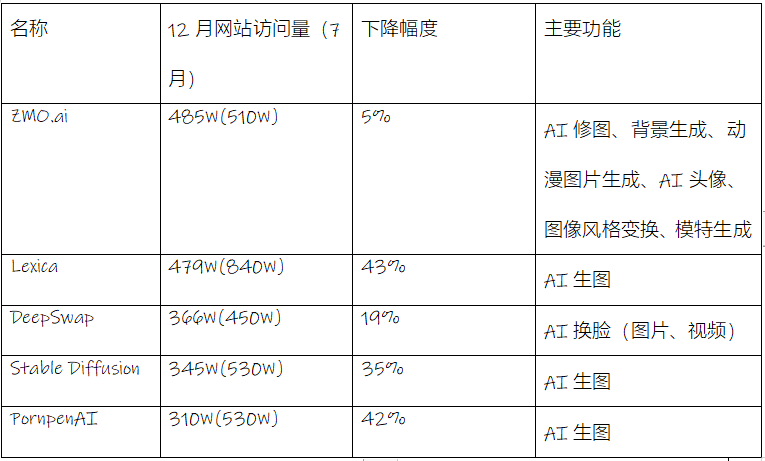 在落榜的 5 款产品中,首先要明确的是,这些产品虽然跌出 Top100,但是流量还都在百万级别,另外鉴于 Stable Diffusion 为开源模型,PornpenAI 专注于色情图片生成,情况特殊,所以本文主要聚焦 ZMO.ai、Lexica、Deep Swap 三款产品的流量下滑情况加以分析。