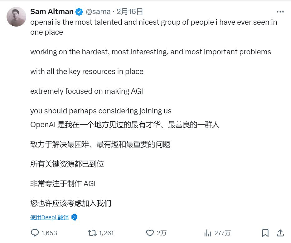 另外,相比谷歌亡羊补牢式地招回人才,OpenAI虹吸全球顶级AI人才的气势如虹。就在2月份,Altman公开在社交媒体上表示,“所有关键资源都已到位,非常专注于AGI”,在线诚聘人才。AI的竞争归根结底是人才的竞争,因为AGI最重要的是智力资源,而最顶尖最优秀的人才一共只有那么多,这也让人为谷歌能否追赶上OpenAI捏了一把汗。