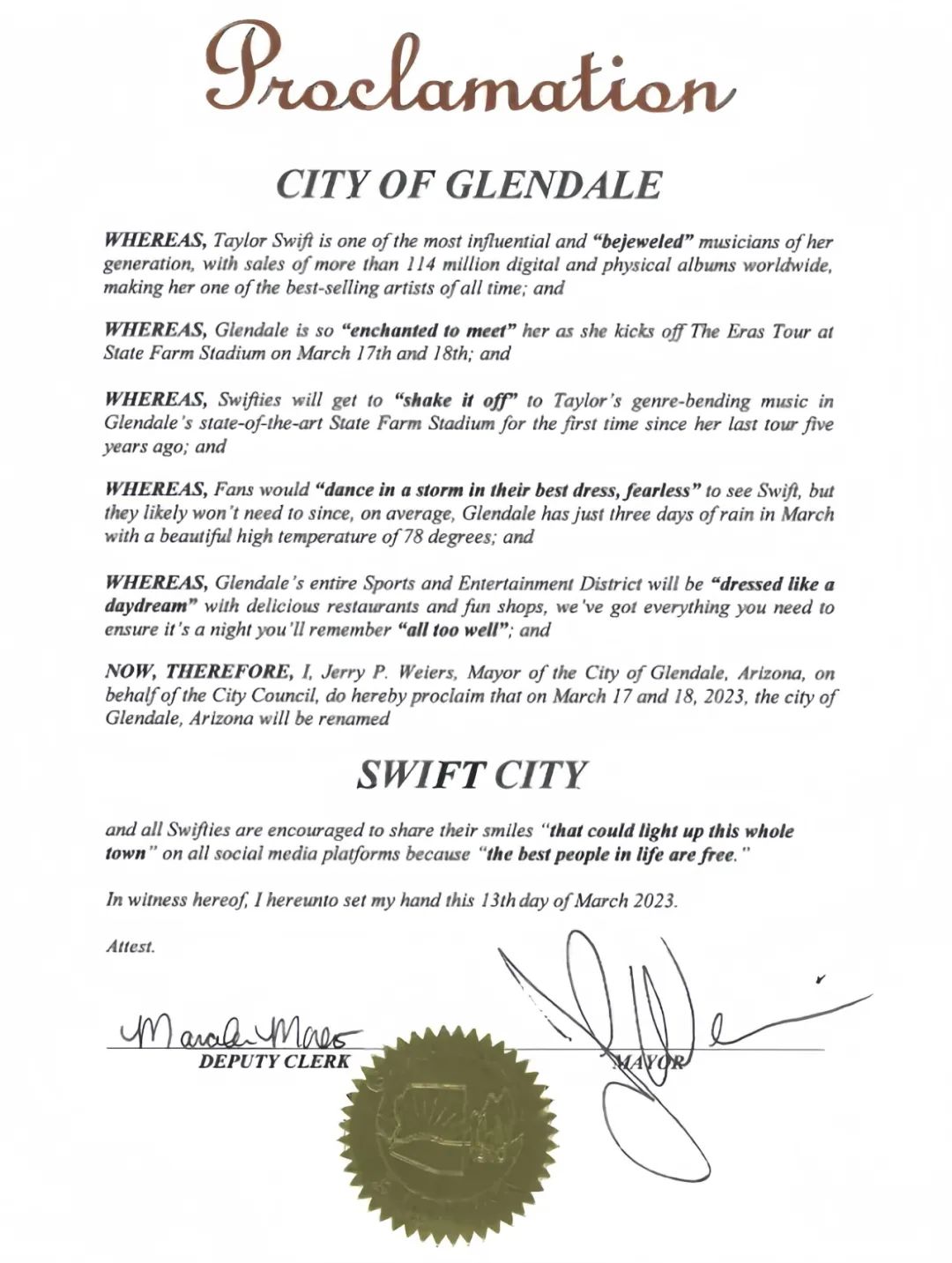 2023年3月,演唱会首演举办地、亚利桑那州格伦代尔市宣布将本市改称“Swift City”,该名称在3月17日到18日的演唱会期间生效。