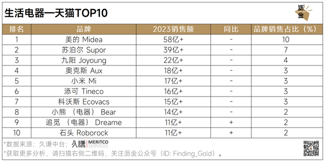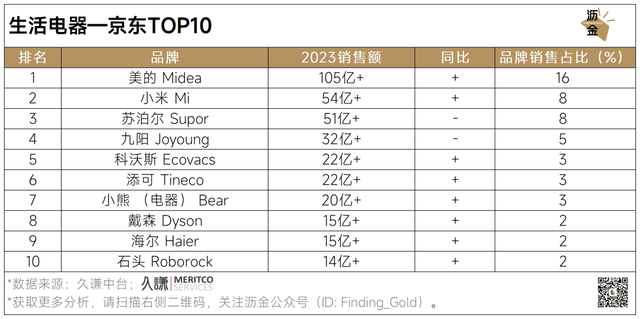 从TOP10品牌榜单来看,美的稳居三大平台榜首,在京东销售额破百亿元,市占率达16%,展现出强大的品牌实力和市场竞争力。