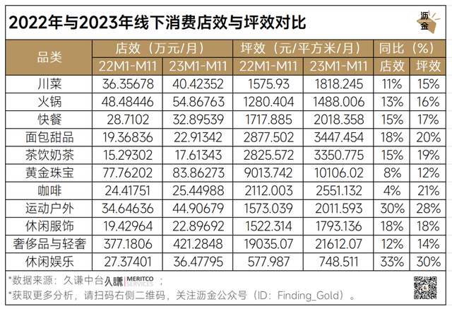 2023年,线下消费整体呈现上升态势,其中休闲娱乐、运动户外、面包甜品、茶饮奶茶等店效、坪效大幅增长。