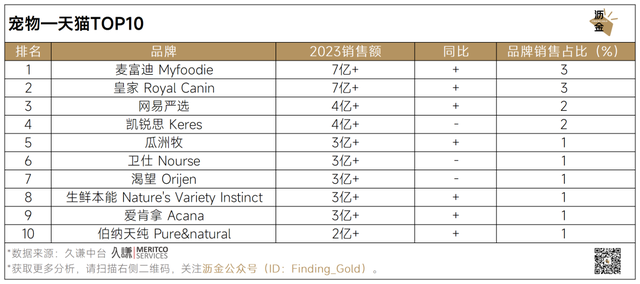 从品牌TOP10榜单来看,天猫平台中,麦富迪和皇家以性价比优势稳居行业龙头地位,同比均小幅上涨;网易严选发展势头较好,同比上涨显著。