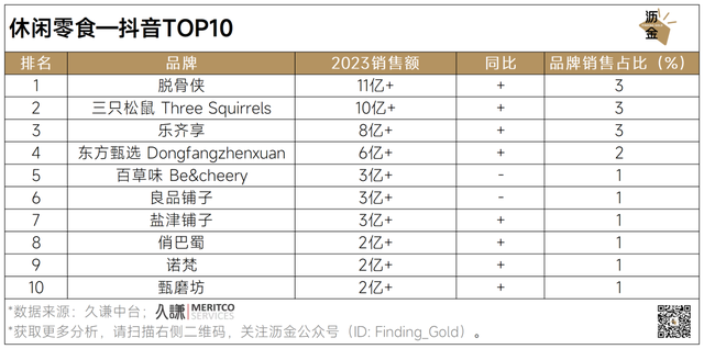 而抖音的行业集中度低,且榜单内品类丰富,新玩家在抖音有更多机会。其中,主打无骨鸡爪的脱骨侠、爆品为香酥小麻花的乐齐享等新锐品牌跻身前三,实现大幅增长。