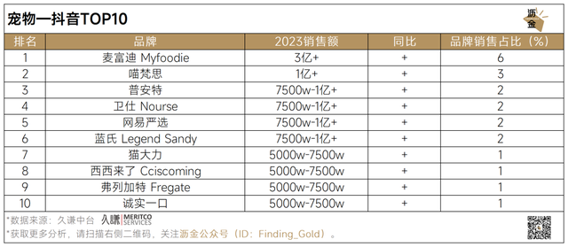 抖音TOP10品牌均显著增长,其中麦富迪凭借3.1亿元销售额遥遥领先,夺得榜首;主打宠物药品的普安特同比暴涨659%。