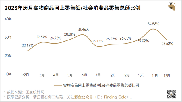 从电商规模看,实物商品网上销售额累计值从2023年初的1.75万亿提升至年末的13.02万亿,电商规模进一步扩大。