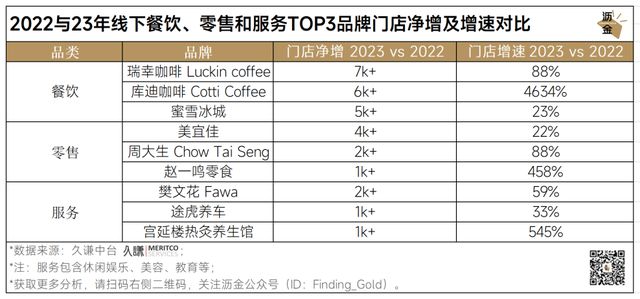 线下餐饮、零售和服务TOP3品牌门店净增、增速对比