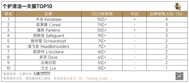 天猫TOP10品牌榜单中,卡诗凭借专业的头皮护理和高端的定位,击败潘婷、海飞丝等,以超15亿元的销售额稳居榜首。