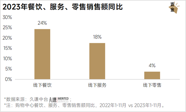 2023年线下购物中心的餐饮、服务和零售业都在涨,其中餐饮涨幅最大,销售额同比上涨24%。