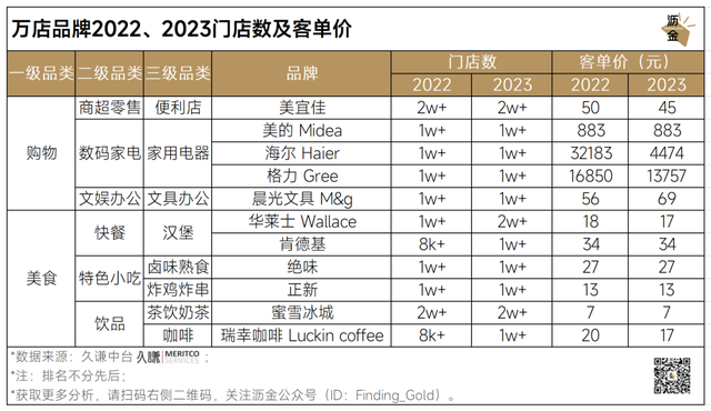 万店品牌2022、2023门店数及客单价