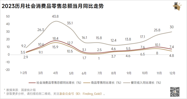 但因为2023年消费的高增长是建立在2022年的低基数之上,所以整体来看中国消费市场仍为弱复苏状态。